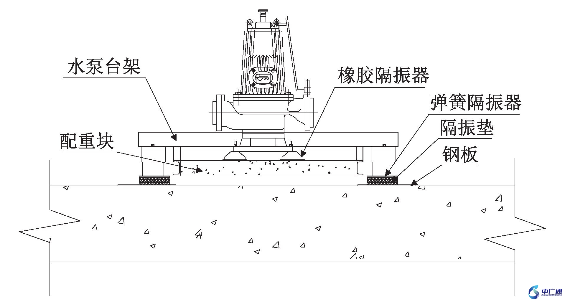 由于噪聲源的產(chǎn)生是振動引起的,因此對噪聲的控制實際轉(zhuǎn)變?yōu)閷φ駝拥目刂啤U駝游廴究刂频?個途徑為:振源控制、傳遞過程中振動控制、對防振對象進行控制。常用的隔振設計方式為支承式、旁托式、內(nèi)嵌式。支承式是指隔振器設在被隔振設備基座或剛性臺座下。旁托式是指在臺座兩側(cè)設旁托支架,將隔振器安裝在旁托支架下部。內(nèi)嵌式是將隔振器嵌裝于鋼筋混凝土隔振臺座內(nèi)。